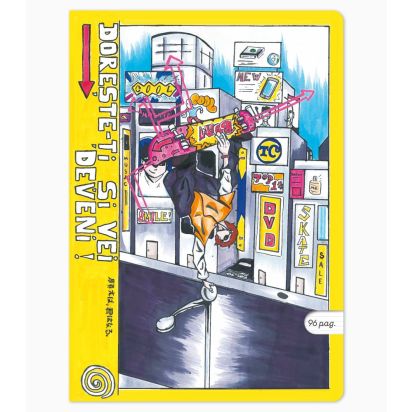 Ilustratia „Saritura”, realizata de Tudorache Cezar, elev in clasa a VIII-a la Scoala Gimnaziala „Federico Garcia Lorca”, Bucuresti, surprinde energia si curajul unui tanar aflat in plina ascensiune. Intr-un decor urban plin de culoare si dinamism, personajul isi urmeaza visul cu determinare, amintindu-ne ca reusita incepe cu indrazneala de a crede in tine. Mesajul „Doreste-ti si vei deveni!” completeaza perfect atmosfera optimista, transformand acest caiet intr-un spatiu care nu doar aduna idei, ci le inspira sa creasca.